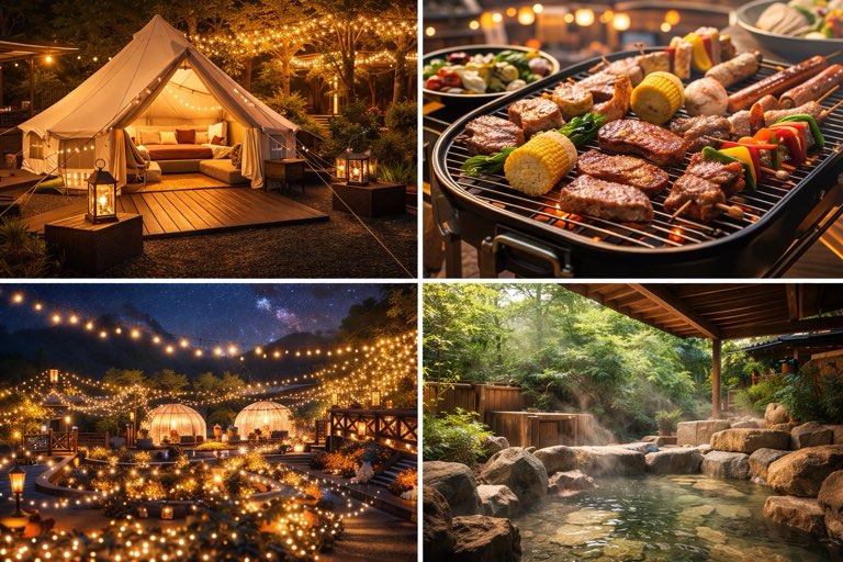 アウトドア初心者でも安心して楽しめる設備、豪華BBQ、温泉、さらに幻想的な