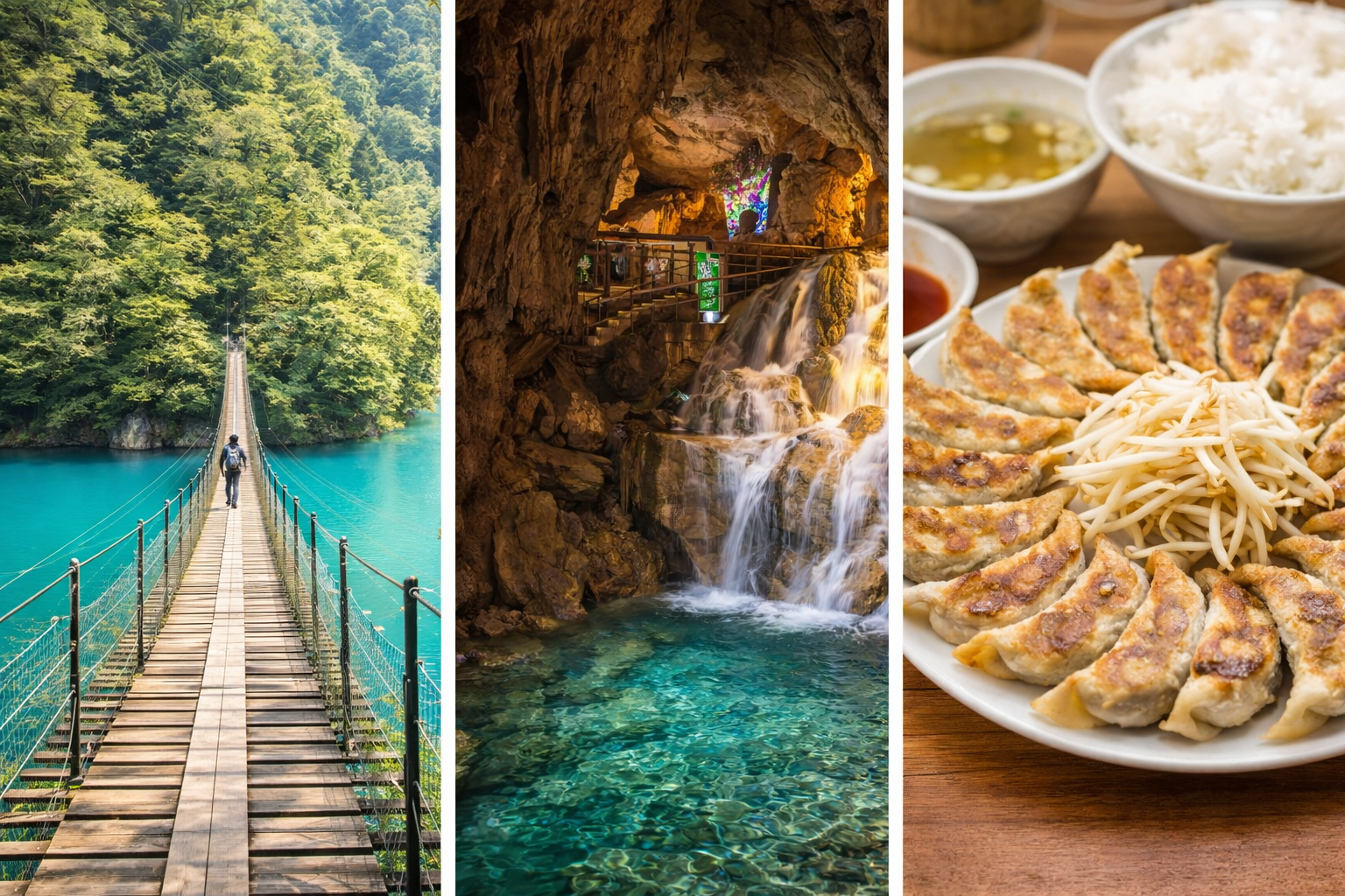 夢の吊り橋の絶景、竜ヶ岩洞の神秘的な空間、そして浜松餃子の名店。